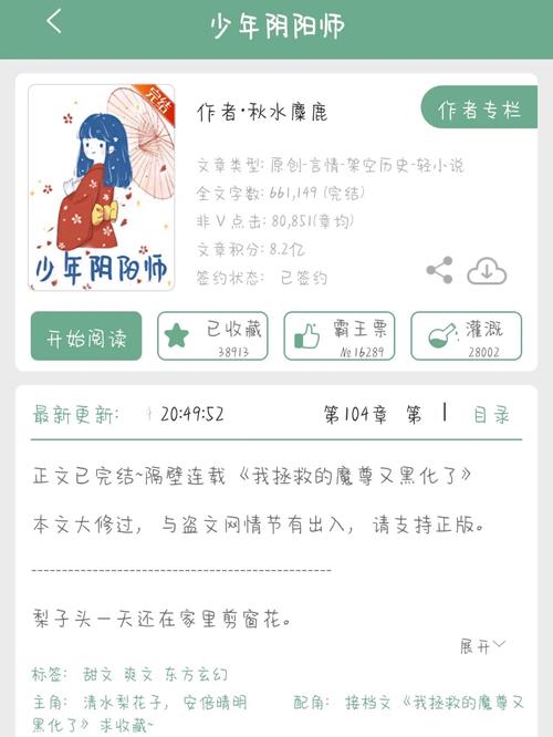 〖肆〗、《少年阴阳师》由日本作家结城光流撰写,部分章节被改编为动漫,讲述了年轻的阴阳师的成长故事。《错逢落樱》和《平安京之樱花物语》系列,描绘了女主角穿越至平安京,与安倍晴明相遇的浪漫情节。《爱上阴阳师》及《阴阳师之凤舞平安》则进一步探索了主角之间的感情纠葛,展现了他们之间的爱情。