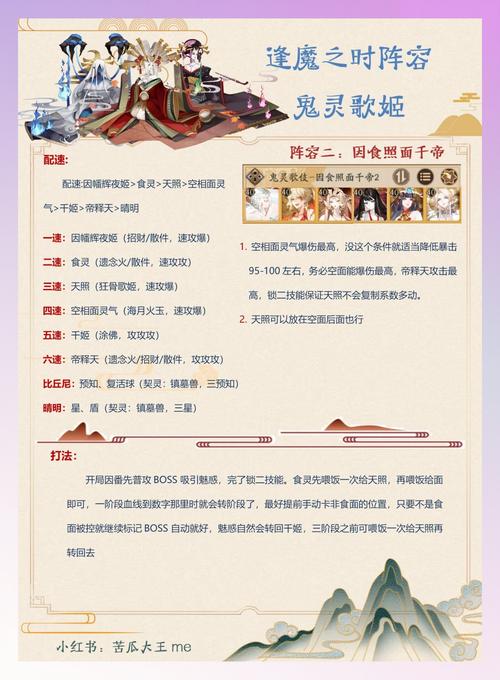 〖壹〗、首先,对于追求极致效果的玩家,顶配阵容是一个不错的选取。推荐组合包括天照、祸津神、初音未来、龙珏和铃鹿御前。在这个阵容中,铃鹿御前需要锁定普攻,而其他式神则全部使用妖术。这样的搭配能够在短时间内造成大量伤害,快速通关。