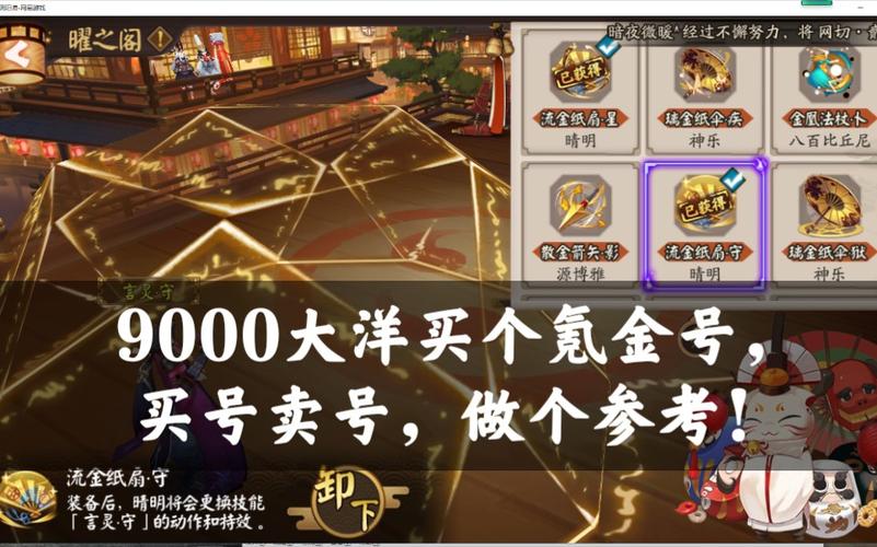 全图鉴,尤其是SSR图鉴,伪全图鉴也可以接受。逢魔章和天下章,综合练度高的号头像框如月见黑、日之曜、日月同辉。头像框:月见黑400连抽无SSR获得,日之曜ssr全集赏获得,日月同辉500连抽无SSR+日之曜。皮肤:阴阳师、式神、庭院皮肤,特别是活动限定皮肤。