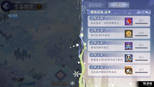 〖叁〗、在参加阴阳师雪落樱祭时,首先点击院子里的小雪花进入活动页面,然后进入探究樱林。第一个是染井樱林,通关时需开启五个秘宝,25格内可通关,鬼王战2分钟内就能获胜。接着是进入一叶樱林,需要打开10个秘宝,不击败妖灵通关,25格内通关即可。