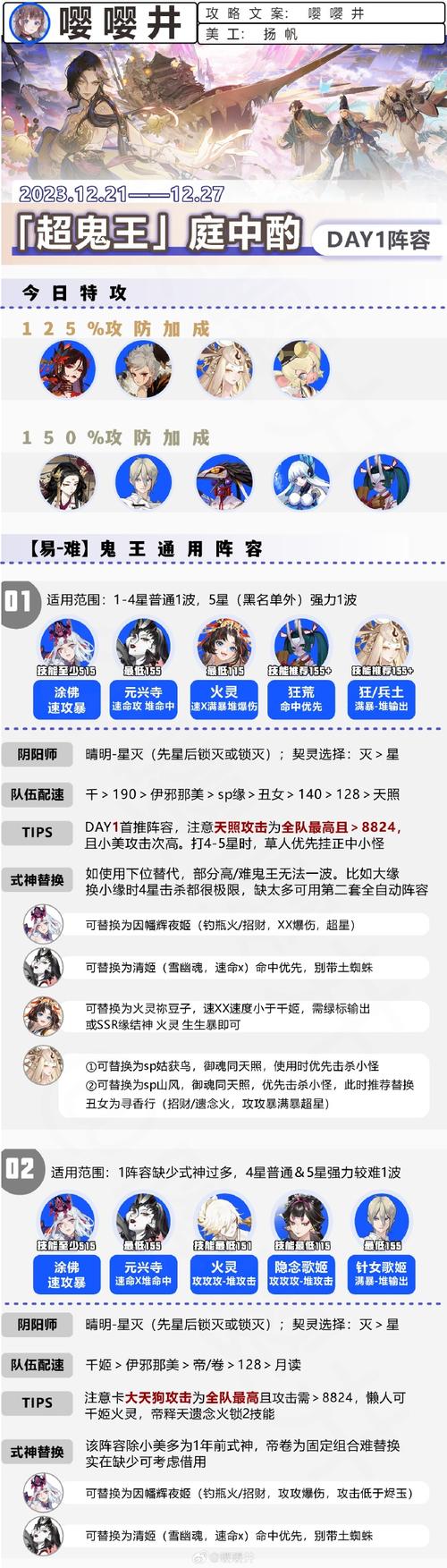 一速:火灵或招财追月。二速:幽魂雪土蜘蛛sr清姬。三速:狂荒丑女。四速:针歌佛爷。五速:招财或火灵缘结神。核心输出:蝎女+书翁:利用书翁炸的伤害触发蝎女溅射,再配合丑女,可以打出高额伤害。蝎女在特攻日伤害可达1100万,非特攻日也能达到800万。开局操作:开局标记boss和己方sr清姬。
