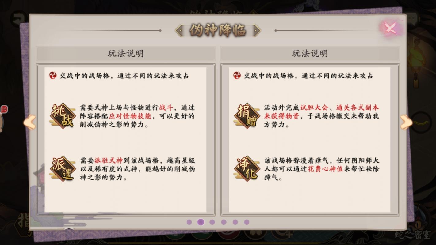 〖伍〗、【净佛刹】:六道之门的核心副本,选取试炼式神后,自带5个式神消耗60体力进入挑战。根据地图自由制定前进路线,偶遇不同事件,获得技能与秘宝,最终挑战魔罗王;通关后根据评分表现获取逢魔御魂、印记、御神经验等奖励。