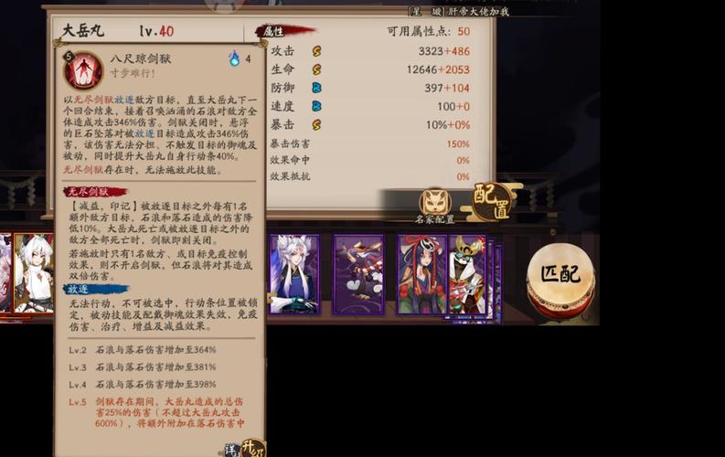 大岳丸的四技能“断末无铭”对敌方全体造成180%伤害,满级后240%,并驱散敌方全体一个增益状态。大岳丸作为主输出和控制式神,搭配阵容广泛,实用性强。建议六星麓铭大岳丸3S的基础面板数据为:S攻击 3350,A生命 11393,A防御 441,S速度 115,S暴击 10%,初始暴击伤害 150%。