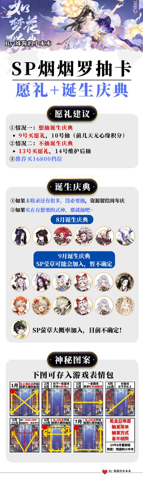 〖伍〗、阴阳师周年庆抽卡规则概述 今年的周年庆抽卡活动,依旧分为旧式神和新式神卡池。重要的是,玩家在召唤过程中将享受到以下福利: SSR/SP必定未收录:首次召唤出SSR/SP式神时,必定是玩家未收录的式神。