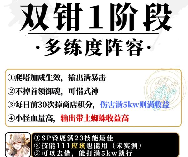 〖叁〗、第一套阵容配置:在第一阶段,紧那罗施放妖术,千姬使用插贝戟后锁定二技能以叠加buff,腹肌锁定三技能,蝎女同样锁定三技能;在第二阶段,通过通车队友信息共享标记隐藏的龙虾单位进行输出,第三阶段持续输出。蜃气楼行动一次让土蜘蛛出现,这将是决定最终成绩的关键。
