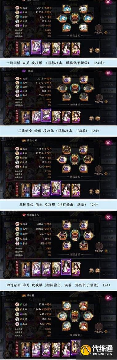 〖肆〗、座敷童子:4火灵+2效果抵抗,主要堆2号位速度。姑获鸟:针女四件套+暴击2件套,速度攻击暴击都是可选属性,暴击优于攻击。白狼:主要作用是收割对方的残血和脆皮,也可以选取带第二个姑获鸟或者鬼使黑。