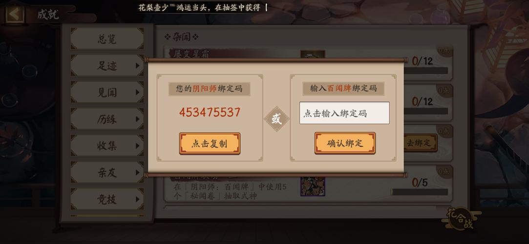 〖壹〗、在《阴阳师》的游戏界面中,您可以通过成就或杂闻类型找到百闻牌联动成就的选项。点击进入绑定界面后,按照提示输入百闻牌的绑定码即可完成两个游戏账号的绑定。成功绑定后,您将能够获得相应的宠物作为奖励。