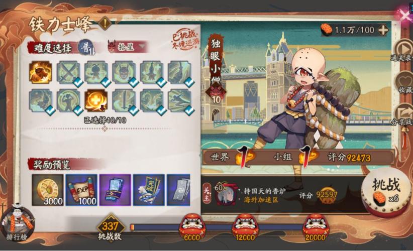 - 妖气封印和河畔童谣:也可以获得提灯小僧。 阴阳师小僧的打法 - 独眼小僧:最快的方法是挑战第18章副本,一次可以获得14只独眼小僧。但是,这种方法并不推荐,因为它需要消耗较多的式神挑战券。更有效的方法是刷第11章副本,一轮可获得7只,两轮即可完成任务,且消耗的体力较少。