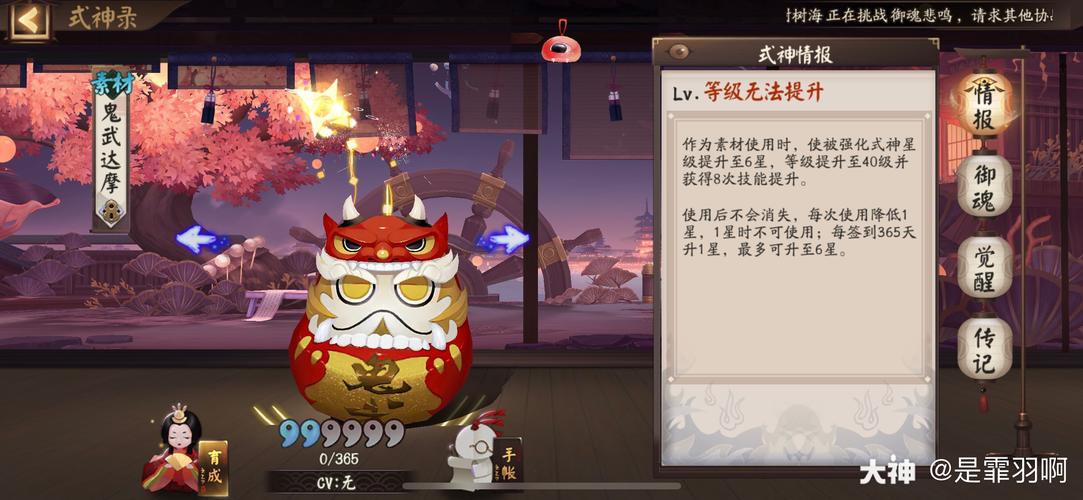 在《阴阳师》游戏中,玩家通过签到1500天可以获取鬼武达摩。使用鬼武达摩后,可以将式神的星级直接提升至6星,并且技能升级8次。这无疑为玩家提供了一种快速提升式神实力的途径。需要注意的是,每次使用鬼武达摩都会导致其等级下降1级,直至降至1星后无法继续使用。