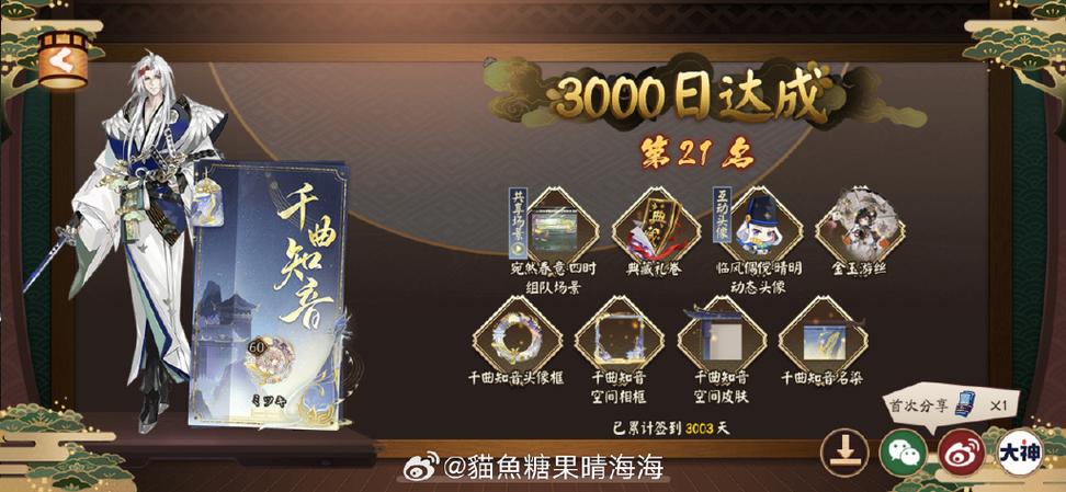〖贰〗、签到3000天成就专享礼将于10月30日维护后正式开放,签到天数达3000天的阴阳师将享有专属成就奖励。「专属成就奖励展示·神乐皮肤」点点水墨缓缓流淌,金鱼游水涟漪轻漾。目光盈盈笑语稚言,铃音作响荡起余忆。神乐限定新皮肤【金玉游丝】将于10月30日维护后上线,阴阳师达成3000天签到成就即可免费获取。
