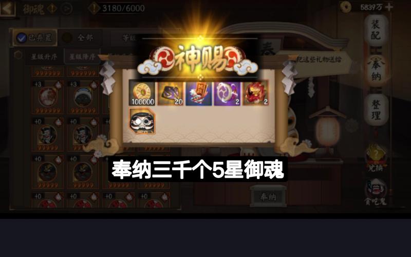在《阴阳师》游戏中,关于五星御魂的处理方式,许多玩家倾向于将其奉纳。这不仅是因为奉纳可以有概率获得诸如金币、金蛇皮和勾玉等珍贵资源,还因为这些资源对于游戏的进展至关重要。具体来说,当玩家的御魂等级达到一定要求时,可以选取将其奉纳。