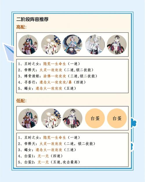 在阴阳师游戏中,八岐大蛇十层对于新手玩家来说是一个挑战。推荐的阵容为御魂十层新手阵容:四星兔子(招财速生生),四星座敷童子(火灵生生生),以及一个六星针女式神(姑获鸟即可针歌攻攻暴)。
