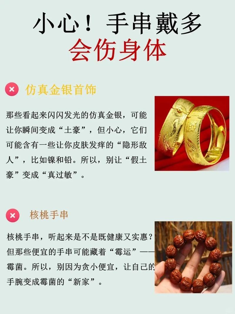 低质人造手串。详细解释:人造手串材质问题:一些手串由低质人造材料制成,如塑料、合成树脂等。这些材料可能对人体皮肤产生刺激,甚至引发过敏、瘙痒等问题。因此,这类手串不宜佩戴。手串的化学成分风险:某些手串表面可能经过化学处理,含有对人体有害的化学物质。