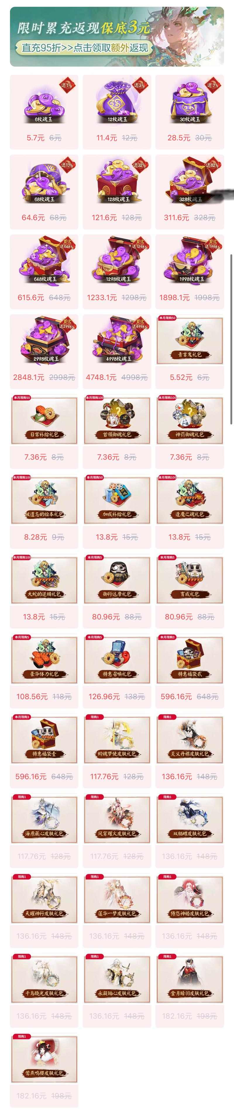 〖陆〗、减少了玩家的氪金压力。这种氪金方式不仅提升了玩家的游戏体验,还增加了玩家的满意度。综上所述,花合战和月卡运势礼包是较为划算的选取。它们不仅提供了丰富的资源和持续的福利,还增加了玩家的游戏体验。通过这两种氪金方式,玩家能够在游戏中获得更多的乐趣和满足感。