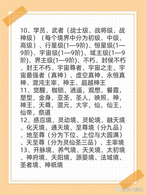 〖叁〗、这些阶别从低到高分别是:灵武、元武、玄武、天武、武君、武王、半帝、武帝、半祖、武祖、真仙、天仙、武仙、尊者、至尊、武尊、半神、真神以及武神。每个武力阶别又细分为一至九品,天武境以上的修炼者具备飞行能力,或者通过特殊武技维持飞行。