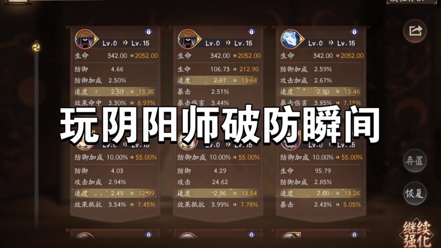 阴阳师结界卡合成技巧主要包括以下几点:合成规律:通常情况下,可以采用1个高星结界卡加上2个低星结界卡的方式进行合成,这样有较大概率提升星级。同星级的卡进行合成,比如1+1+1或2+2+2等,升级率高,容易跳级,但变异率一般。