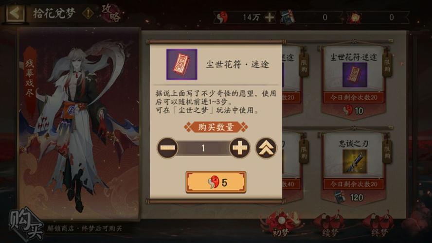 〖壹〗、彼世之蝶获取:可通过尘世之梦玩法获得道具彼世之蝶,每天获得上限为5。2021年1月8日23:59以后,只能前往活动商店拾花兑梦中购买彼世之蝶。