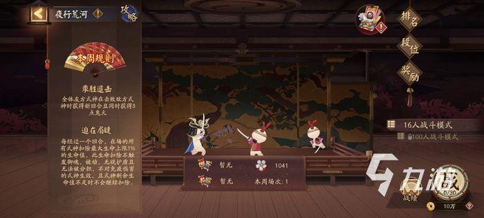 进入残河溟夜活动界面后,朋友们们可以看到三个重点玩法,夜行荒河、尘世之梦和凋零之梦。夜行荒河需要消耗金币进入,首次免费,进入后可以选取系统给出的式神配置阵容和其它玩家进行对战,分为16人对战模式和100人对战模式,胜利后会根据最后的名次获得不同的奖励。