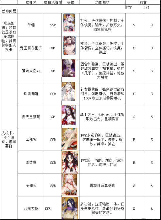 〖陆〗、阿修罗、紧那罗:擅长短时间内进行PVE活动中的单体输出,是游戏中的核心式神之一。食灵、帝释天:作为较为全能的辅助式神,食灵适合作为新手的魂土开荒,而帝释天则适用于多种PVE活动。第二梯队 饭笥:更适合于短期爆发输出的场合,常驻于魂土、魂海或御灵之中,但由于其难度较高,不太适合新手体验。