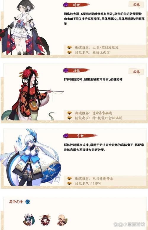 鬼使黑、鬼使白、姑获鸟、犬神,这些式神在SR级别中拥有较高的单体输出能力,值得培养。SSR级:妖刀姬、茨木童子、荒川之主、阎魔,作为SSR级别的式神,他们的单体输出能力堪称顶尖,是后期推图和战斗的主力。