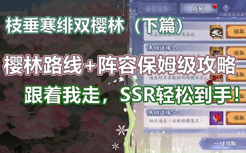 〖叁〗、阴阳师雪落樱祭第三天枝垂樱林路线攻略如下:路线图及成就条件 成就条件:初次通关;拾取所有秘宝通关;击败所有怪物通关;移动25格内通关;完成所有成就。路线图:25格速通:具体路线需根据樱林内的实际布局决定,但目标是在25格内快速到达终点。玩家需寻找最短的路径,避免不必要的绕路。