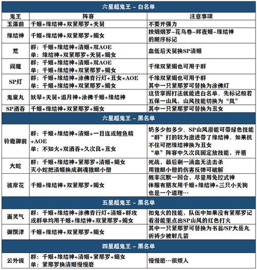 清姬和面灵气:当两面佛被送出时,可以使用清姬搭配高爆伤的面灵气,组合控制和破防效果,打出可观的伤害。不知火:清完小怪后的BOSS阶段,不知火与酒吞(或真天)的阵容通常是比较好的选取,伤害高且应对扣火效果的超鬼王时更稳健。