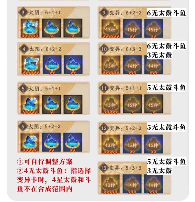 〖壹〗、基本合成公式:三张低星卡有一定概率合成一张高星卡,但星级越高,成功概率越小。三张太阴符咒有小概率合成太鼓、斗鱼或伞室内。任意三张太鼓、斗鱼、伞室内或特殊变异卡,必定合成太鼓、斗鱼或伞室内其中之一。高效合成方案:使用5星胧车卡与两张低星变异卡/特殊卡合成,可100%获得5星变异卡。