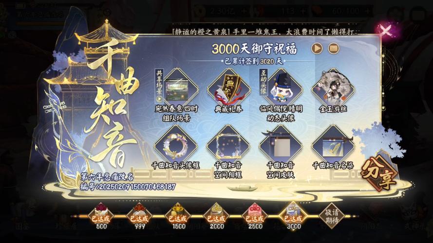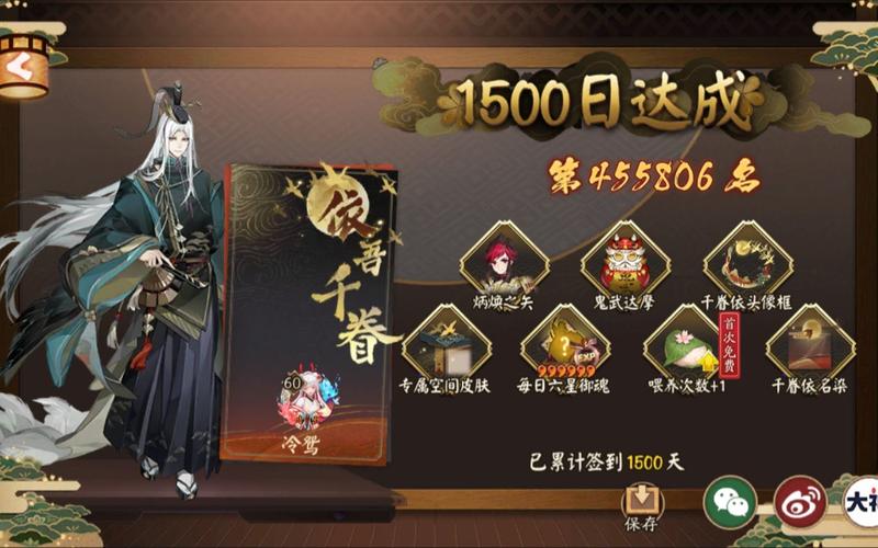 首先,签到1500天的玩家将收获一系列珍贵的奖励:【源博雅皮肤·炳焕之矢】,让你的角色焕然一新;【鬼武达摩】,作为强化式神的有力助手,可提升星级至6星,等级升至40级并享有8次技能提升的机会;【专属头像框·千春依】,彰显你的独特身份;以及【个人空间皮肤·千春流金】,提升你的空间格调。