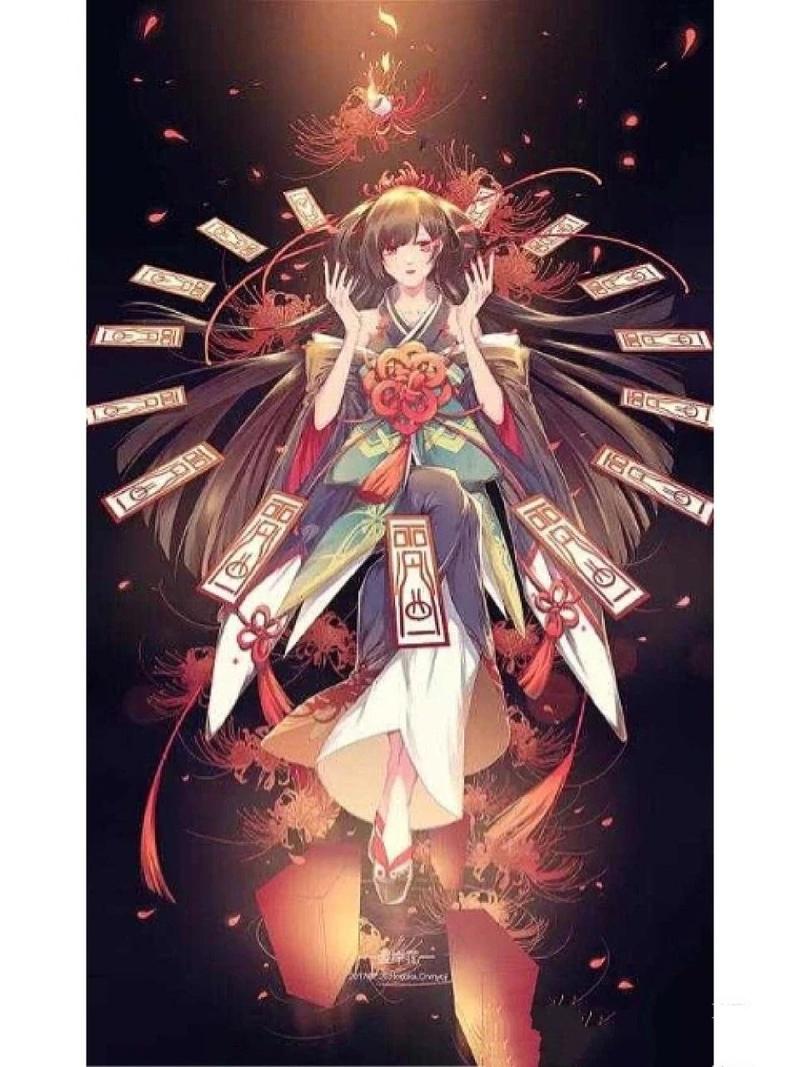 彼岸花-丹【夕暮晚花】太阳逐渐沉入地平线,橙黄的馀晖之下,是一名冷艳女子的身影。夜色即将笼罩大地,却无法遮盖盛开的晚花的艳丽。花海沿著三途川铺开一片赤红,为迷途的幽魂指引去路。鸩-心【琉璃绀羽】绀青覆羽,织网为袖,艳丽的花儿是一种威慑的信号,等待将捕猎者一网打尽。