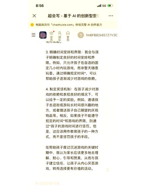 〖叁〗、规划游戏时间: 家长应与孩子共同制定玩游戏的规则,如周末允许玩两个小时,平时则不允许。 初始时,孩子可能难以接受这样的约定,但家长需坚持原则,严格制止孩子违规玩游戏的行为,避免形成不良习惯。 若家长无法时刻监督,可使用防沉迷工具,如设置手机使用时间限制等。