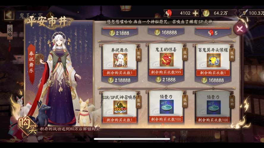 获取方法:想要获得稻荷神御馔津的奉祝舞乐皮肤,你需要参加游戏中的“鬼王之宴”活动。在活动中,你需要努力赚取战功,当战功达到80w时,就可以在活动商店“平安市井”中,花费218888鬼王的馈赠来解锁这款皮肤啦!记得,这是活动免费奖励哦,不需要额外充值。