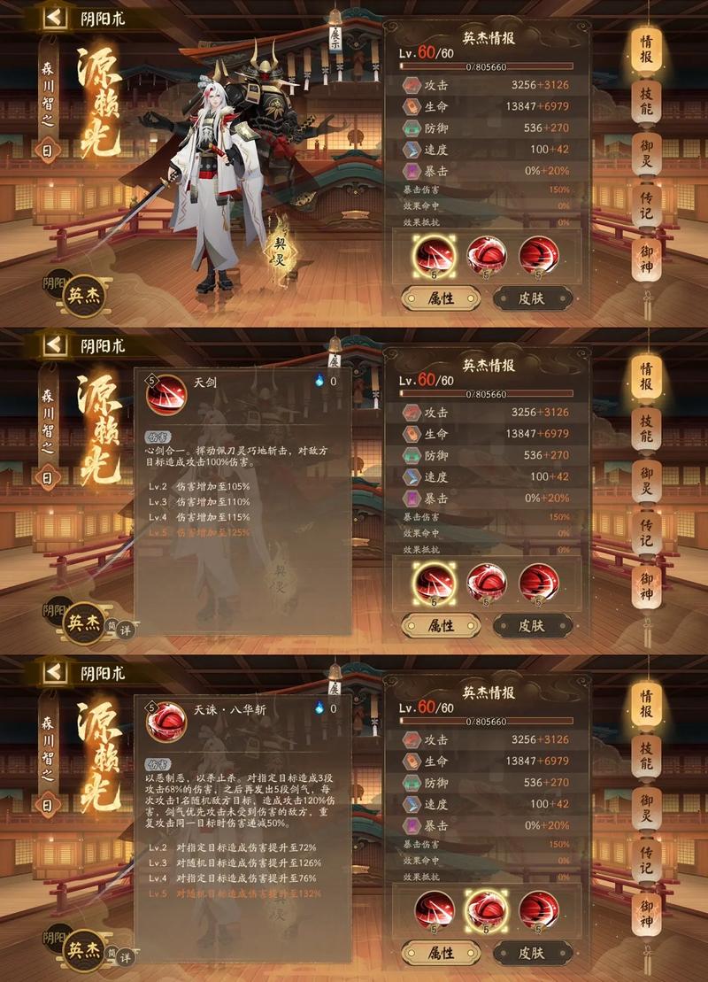 〖壹〗、满级效果:目标受到伤害时,如果生命值地狱30%自动对此目标释放(怪物除外)鬼神之策:鬼兵部发动攻击,降低敌人1回合150点防御力并对敌方全体造成1层剑伤(满级2层)剑伤:通用印记,受到源赖光攻击受到70%真实伤害,并移除1层。