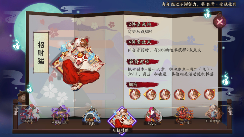 〖叁〗、招福达摩:也就是红色的达摩,作为素材来强化其他式神,可以给式神提供大量的经验,是很好的强化素材,招福达摩升几级后再用,得到经验会更多些。