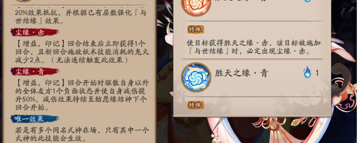 〖叁〗、sp缘结神的技能集回火免控治疗驱散+pve必定二连动于一体,是一个非常强力的辅助式神;普攻可以为自己叠加一层缘结,2技能消耗1火,有青/红两种效果可以选取,给队友一个金色缘结buff同时自己加2层缘结。金色缘结使队友获得行动提前效果,同时行动条的该队友出现缘结闪烁特效。