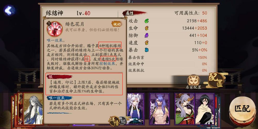 〖伍〗、SP缘结神的二技能能够为指定友方单位附加“胜天之缘”,该状态只能作用于单个目标,若更换目标则会解除上一个目标的结缘效果。再次释放技能则能驱散上一个结缘单位的负面状态。结缘单位与SP缘结神在各自回合结束后,能为对方提供30%的额外行动条,使结缘单位在战斗中更具灵活性。