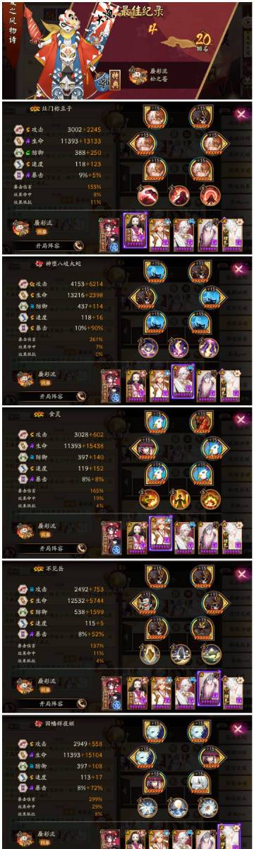 鸦天狗姑获鸟 阵容:不知火+食灵+鸦天狗+千姬+姑获鸟+八百比丘尼 御魂:千姬:招财/散件,一速。鸦天狗:轮入道,速攻攻,二速。食灵:蚌精,攻攻爆伤,三速。不知火:火灵,攻生暴伤/攻攻暴伤,70+暴击,速度128+,四速。八百比丘尼:带「占卜之印」(复活)五速。
