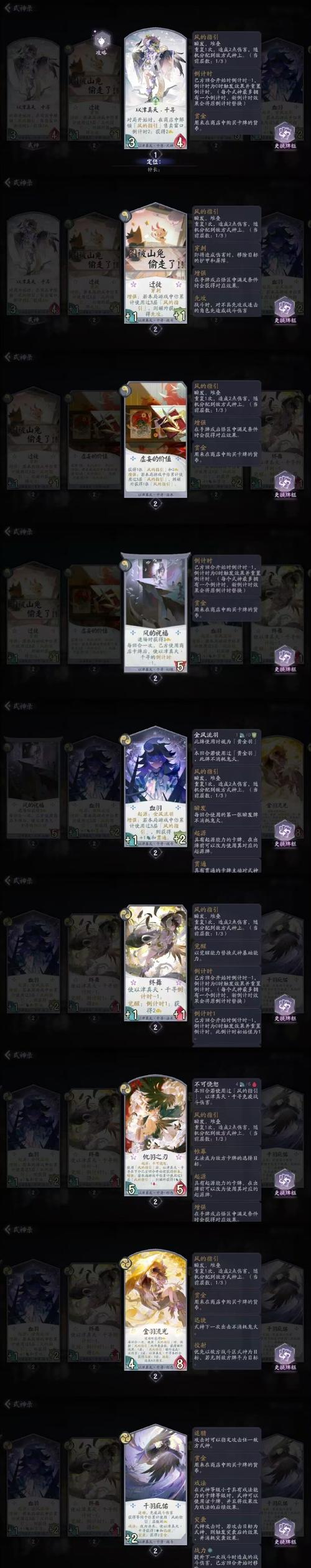 〖壹〗、风袭:指向性法术伤害卡牌,伤害数值取决于大天狗当前力量值。可用于清理敌方准备区的式神,提升大天狗力量。战斗卡牌:选取能提供护甲的战斗卡牌,以增强大天狗的生存能力。对阵思路:前期依靠战斗和“风袭”卡牌击杀敌方式神,让大天狗的力量持续增长。