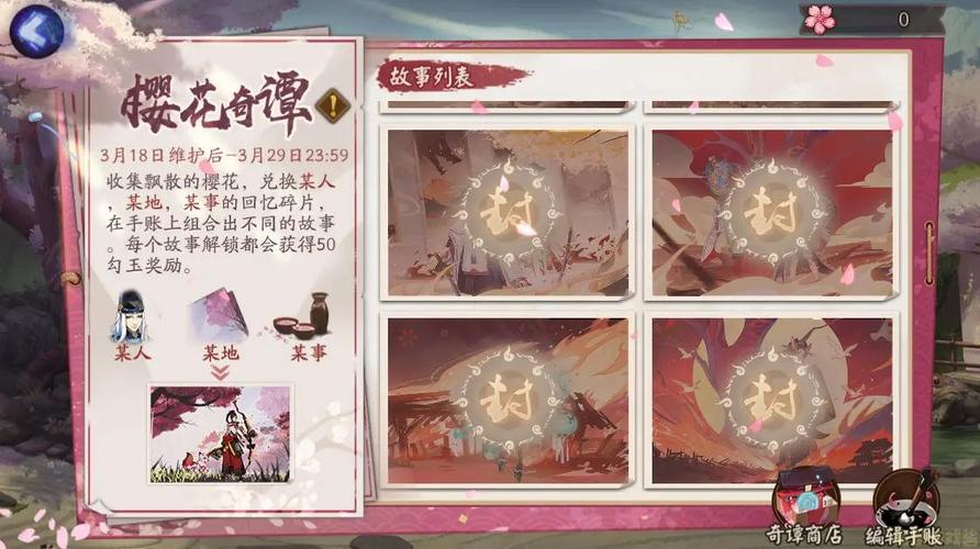 〖贰〗、活动时间与樱花币获取:活动时间:2020年3月18日至3月29日23:59。樱花币获取:通关探索、觉醒、御魂副本时概率掉落,每天上限200个;花合战每天任务经验达100时,额外奖励50樱花币。故事解锁方法:使用樱花币在奇谭商店兑换回忆碎片。回忆碎片分为角色、场景、事件三类,每类有两种。