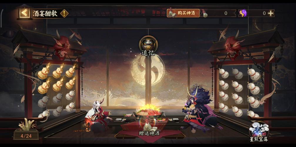 〖贰〗、阴阳师酒宴酣歌活动内容奖励解析酒宴酣歌,挚友同行。星熊童子精心筹备的酒会,众多宾客临门,在酒意与情谊之间,妖怪们嬉笑玩闹,快意自在。将神酒赠予鬼王,他便会回应您的赠礼,将葫芦作为礼物奉上。当阴阳师大人赠予的神酒到达一定数量时,便会收到他赠予的茨竹,用以换取更多珍贵的宝物。