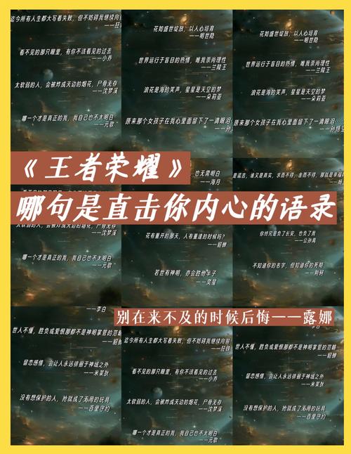 周瑜:“战火纷飞,我却只愿为你守护这片净土。”小乔:“有你在,即使整个世界都与我为敌,我也不怕。”孙悟空与露娜:孙悟空:“曾经,我以为我能一人独挡天下,直到遇见你,我才知道什么是真正的牵挂。”露娜:“你是我生命中最耀眼的光,无论身在何处,我都会循着你的方向前行。
