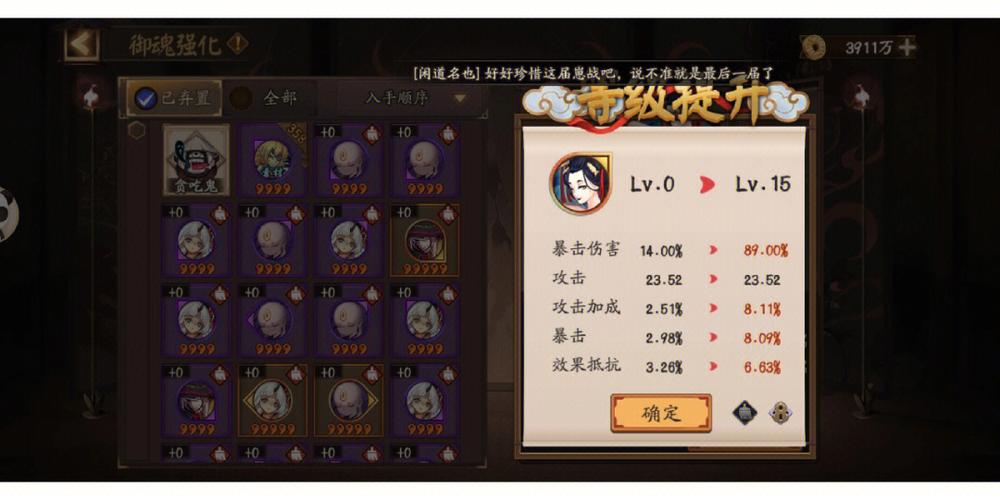 强化后的御魂可以作为素材用于提升其他未达满级的御魂。例如,一个已满级的御魂能将一个未强化的御魂提升至13级,并且仅需消耗三千五金币。相比之下,使用青吉鬼或贪吃鬼进行御魂强化则需要投入三十万以上的金币,因此利用御魂作为素材进行强化不仅便捷,还能节省资源。
