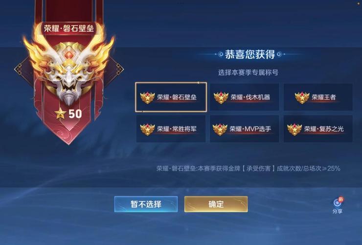 〖陆〗、磐石壁垒本赛季获得金牌【承受伤害】成就次数/总场次≥20%8。最新的称号系统,只有达到荣耀王者(最强王者50星及以上)的人才有获取资格,在这些称号中。