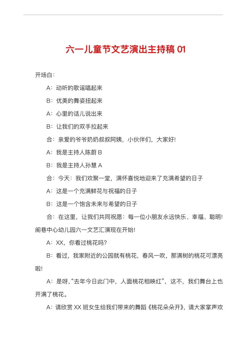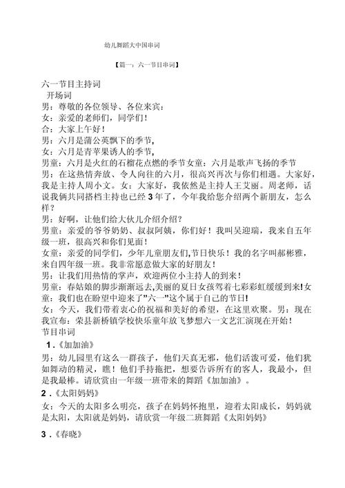 主持人开场白台词幼儿1 甲:各位家长 乙:各位来宾 合:亲爱的小朋友 大家好 甲:弹去五月的风尘,迎来六月的时光。 乙:听,幼儿园里的歌舞声,荡起一片欢乐的海洋。 甲:六月,是童年的摇篮。 乙:六月,是童年的梦想。 甲:六月,是童年的太阳。 乙:六月,是我们大家的节日,我们要尽情的欢畅,我们为它增添光彩。