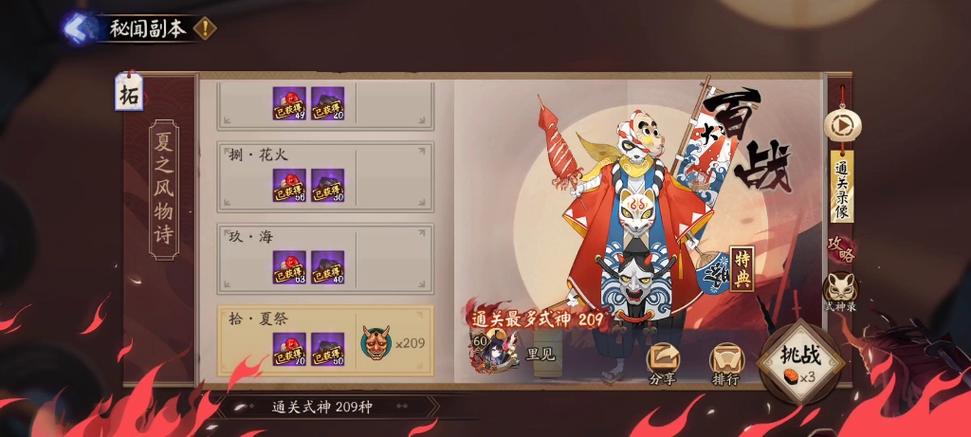 〖肆〗、关卡介绍活动期间,荒川之怒秘闻副本的全部十层关卡首通奖励将会重置,且难度得到提升;系统将根据玩家通关第十层时使用的式神种类数进行排名,排名前列的玩家将获得秘闻印记和限时特典表情等奖励。挑战条件通关原秘闻副本荒川之怒第十层。