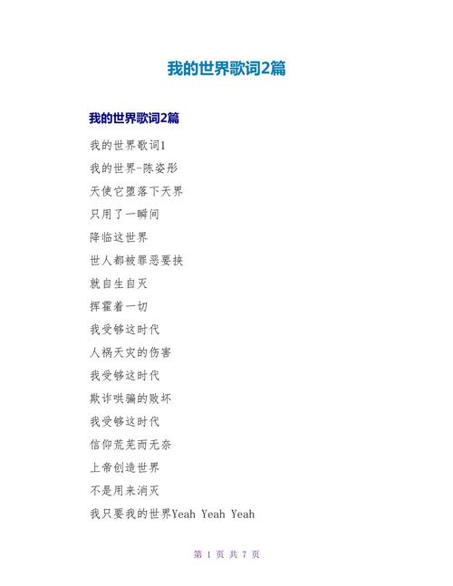 《我的世界》歌词:在这多彩世界,有你我才完美,每个清晨醒来,都与你相随。心中的那片天空,永远都如此清澈,因为有你,我的世界才如此灿烂。你我手牵手,走过每一个季节,那飘落的雪花,是我们纯真的誓言。看那彩虹划过天际,心中充满希望,因为有你,我的世界才如此宽广。