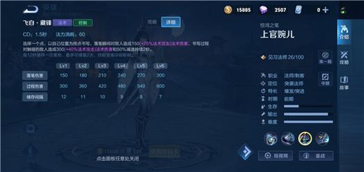 〖叁〗、技能连招的熟练掌握 上官婉儿的飞天技能需要与其他技能相互配合,形成连贯的连招。例如,一技能+二技能+大招,或二技能+一技能+大招等。玩家需根据不同的战斗情况,选取合适的技能连招,以实现最佳的飞天效果。