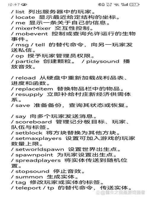我的世界手游指令大全如下:/give:给予玩家物品。使用方法:give 名称 物品ID 数量。/gamerule:更改或查询游戏规则值。例如,mobGriefing false用于保护地形,防止苦力怕炸坑。/weather:设置天气。例如,clear设为晴天,rain设为雨天,thunder设为雷暴雨。/difficulty:设置难度等级。