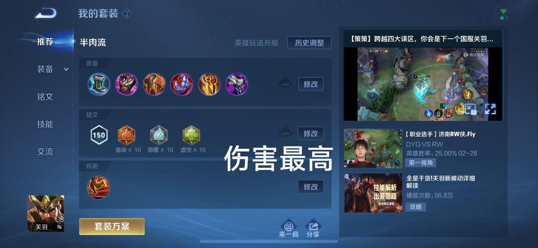出装推荐:顺风:抵抗之靴+救赎之翼+暗影战斧+不详征兆+魔女斗篷+破军逆风:抵抗之靴+学识宝石+不详征兆+魔女斗篷+破甲弓+贤者的庇护召唤师技能:推荐选取净化,可以解除控制,让关羽更容易进入冲锋状态并持续输出。技能连招:3(冲锋)-1-2-平A-平A或者3(冲锋)-2-1-平A-平A。