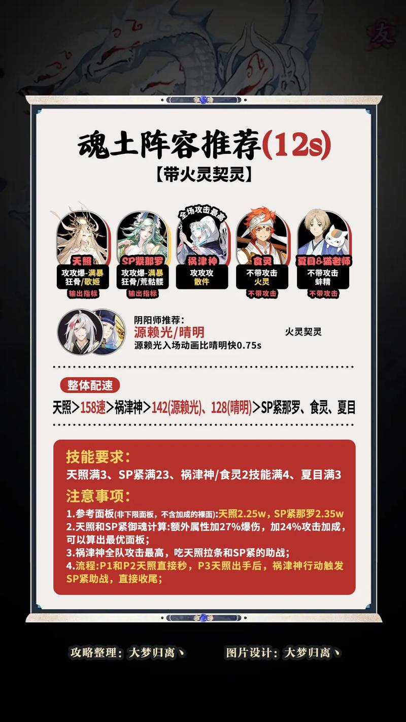 阴阳师饭笥魂土阵容搭配及面板搭配思路如下:阵容搭配: 阿修罗:主要输出角色,配置狂骨+鬼灵歌伎御魂,属性选取攻攻暴伤,速度要求大于156,分别担任一速与二速。 座敷童子:提供鬼火,配置火灵御魂,无需特别关注速度。 食灵:辅助角色,无需特定阴阳师御魂。