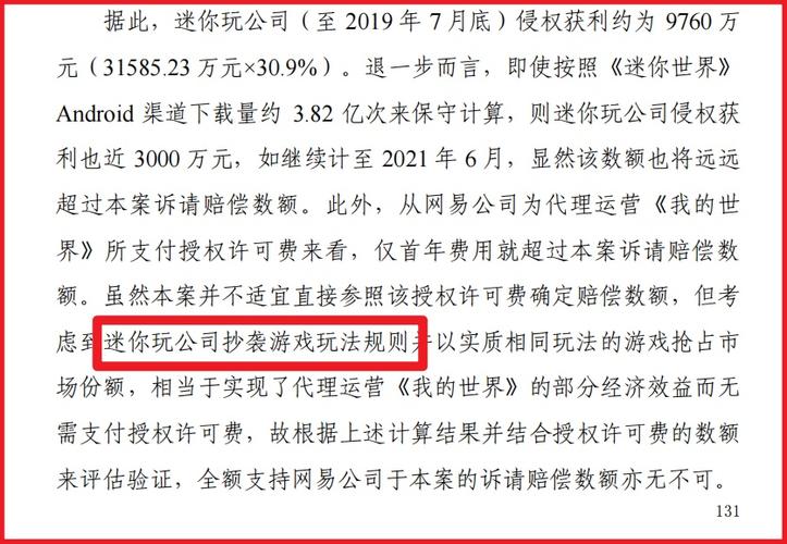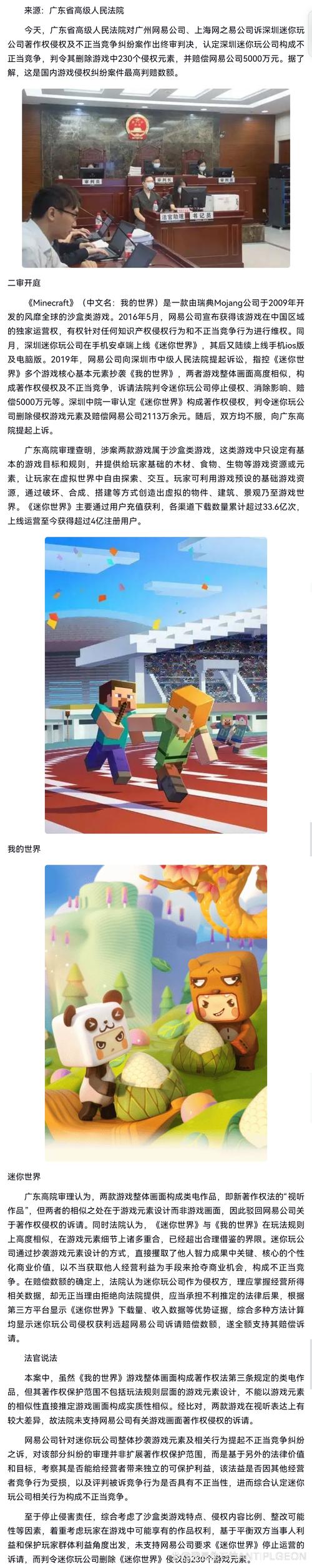 〖伍〗、近日,知名游戏《我的世界》在官方宣布,其与《迷你世界》的版权侵权纠纷案件终于尘埃落定。广东高院对广州网易公司和上海网之易公司诉深圳迷你玩公司的不正当竞争纠纷案做出终审判决,认定迷你玩公司构成不正当竞争,需删除游戏中230个侵权元素,并赔偿网易5000万元,创下了国内游戏侵权案的比较高赔偿金额。